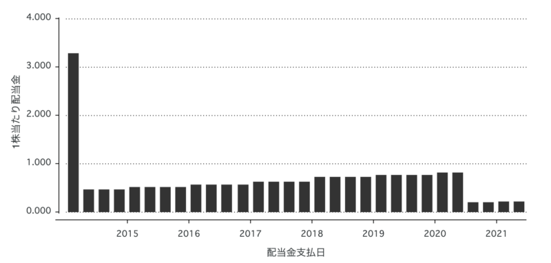 2014年から2015年にかけてと、2020年から2021年の間に、配当金額が大きく減少しています。これは「株式分割」が行われたためです。
