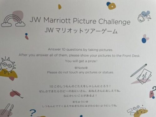 「JWマリオットツアーゲーム」というキッズアクティビティで、ホテル内の場所を示す10個の問題があり、その答えを写真に撮るという内容でした。