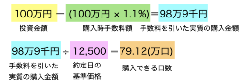 この例の場合、手数料を引いた実質の購入金額を、12,500円の基準価格で割ることで、購入できる口数を導くことができます。