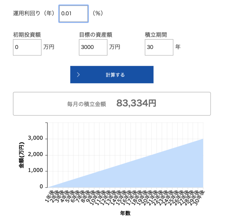 銀行での利息が0.01%と仮定し、30年間で3000万円を目指す場合、毎月約83,000円の貯金が必要になります(下のシミュレーション結果画像)。住宅ローン・子供の養育費・日々の生活費などが必要になる中で、毎月83,000円を貯金できる方は、ほとんどいないと思います。