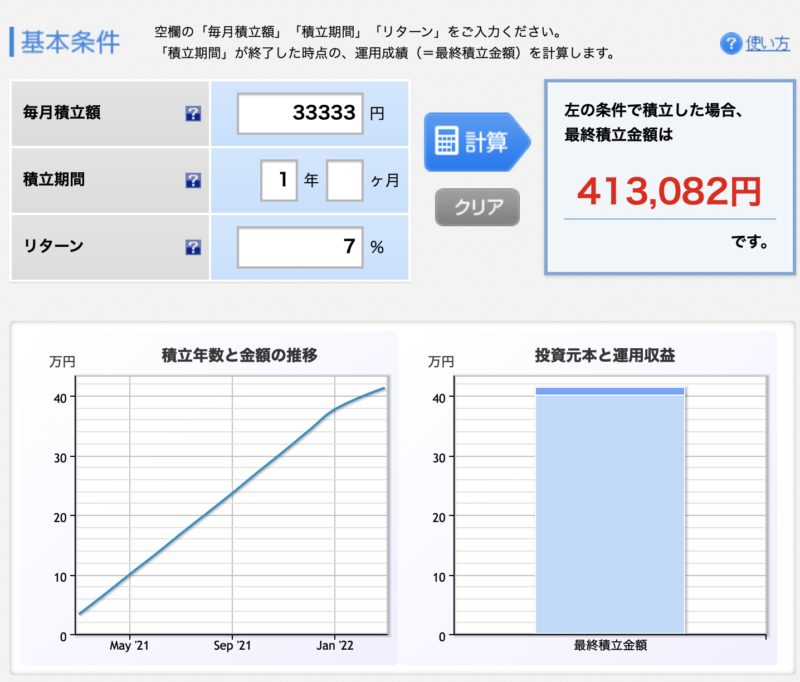 では、さっそく40万円を20年間運用するといくらになるか、計算してみましょう。計算は、先ほどと同じく、初年は毎月33333円投資、翌年〜20年後までの19年間は、年7%で運用と仮定します。