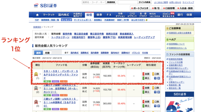 投信ページの中央・中段に「投資信託ランキング」があります。その販売金額ランキングの第1位が「SBI-SBI・バンガード・S&P500・インデックス・ファンド」なので、それをクリック。