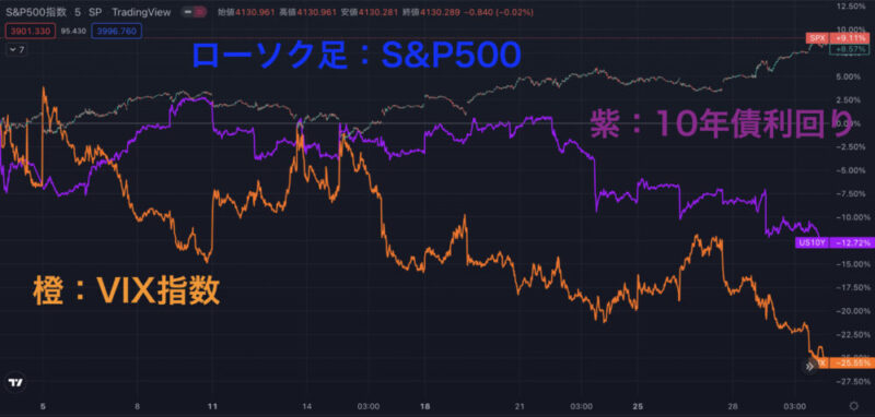 最後に、S&P500と「恐怖指数(VIX指数)」「米国10年債利回り」を比較します。