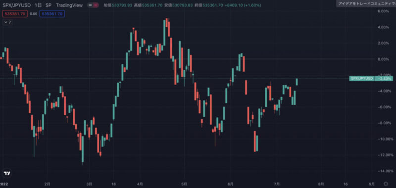 1月3日〜7月15日までで、S&P500(日本円換算)は「-2.43%」となっています。
