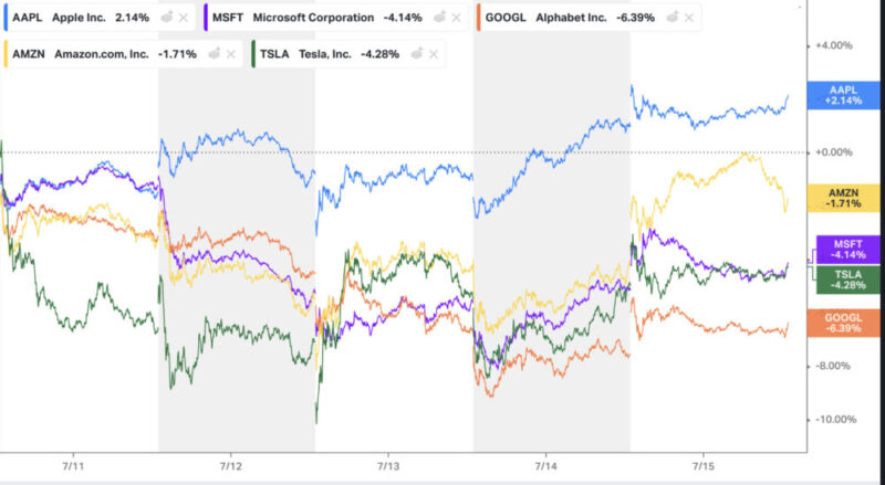 今週は、銘柄によって傾向が異なります。アップル以外は下落、アップルのみ2%以上上昇しています。
